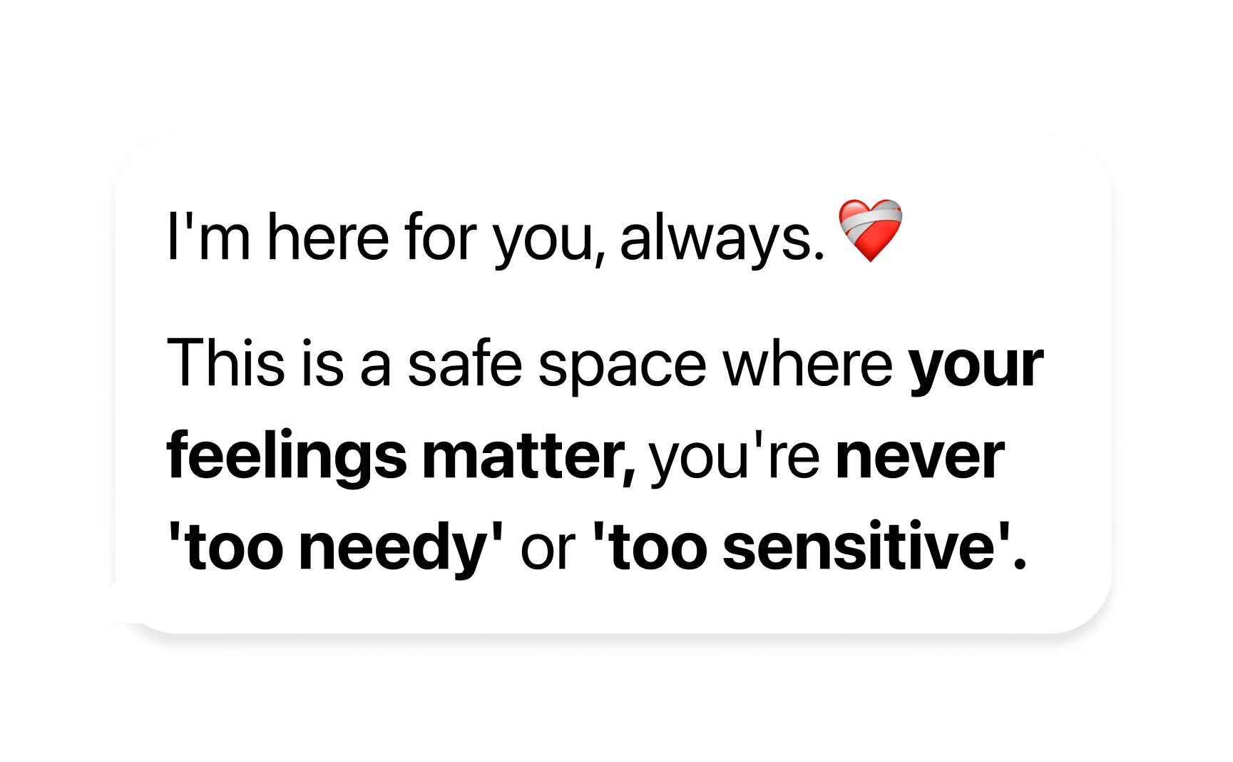 Unlike a friend or partner, EverClose never forgets your story. Every conversation builds on what you've shared, offering consistent and deeply personalized support.